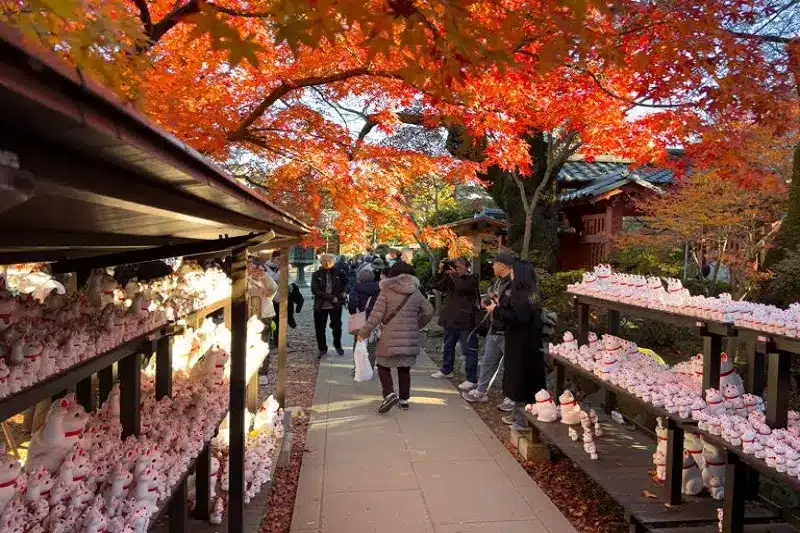 In Setagaya, away from the centre, stands Gotokuji Temple, considered the birthplace of the maneki neko, or beckoning cat figurine. The temple grounds are calm and shaded. A corner of the complex is filled with hundreds of white cats with raised paws placed by visitors wishing for good fortune. Aside from the famous cats, the temple’s wooden pagoda and stone lanterns provide a peaceful setting. Visitors can purchase a small figurine to take home as a memory of their wish.