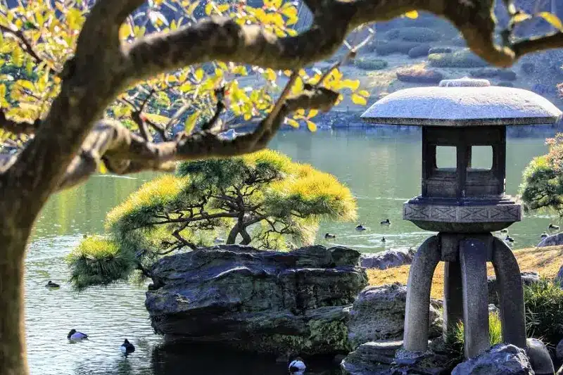 Kiyosumi Garden is a landscaped strolling garden in the east of Tokyo. It features a large pond with stepping‑stone paths that cross the water, small islands, and carefully placed rocks brought from different parts of Japan. The garden displays seasonal flowers and is especially beautiful during iris season. Seating areas around the pond provide quiet spaces to rest and watch colourful koi fish. This garden is less crowded than more famous parks and offers a calm refuge during a busy day.